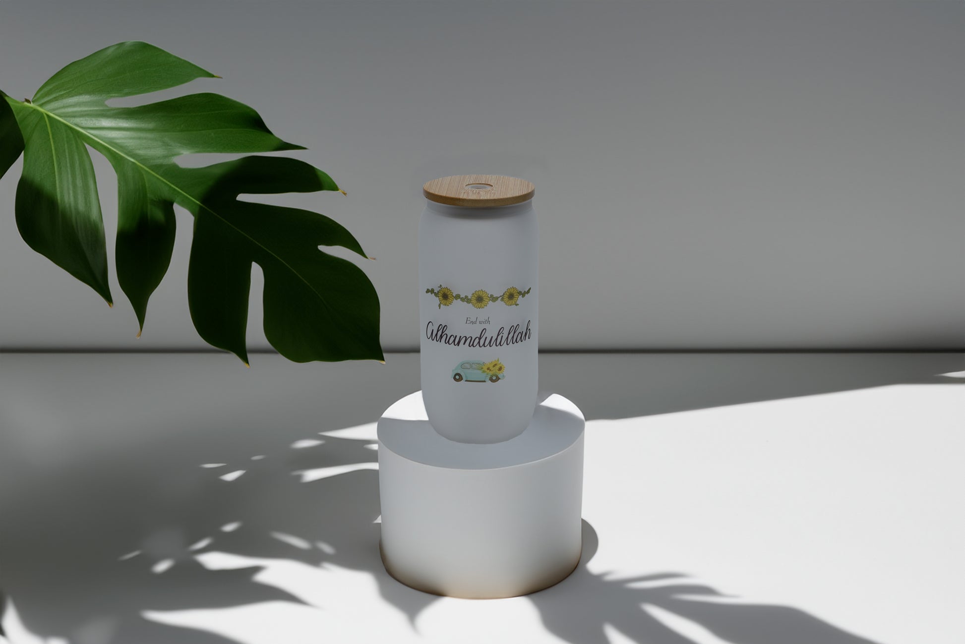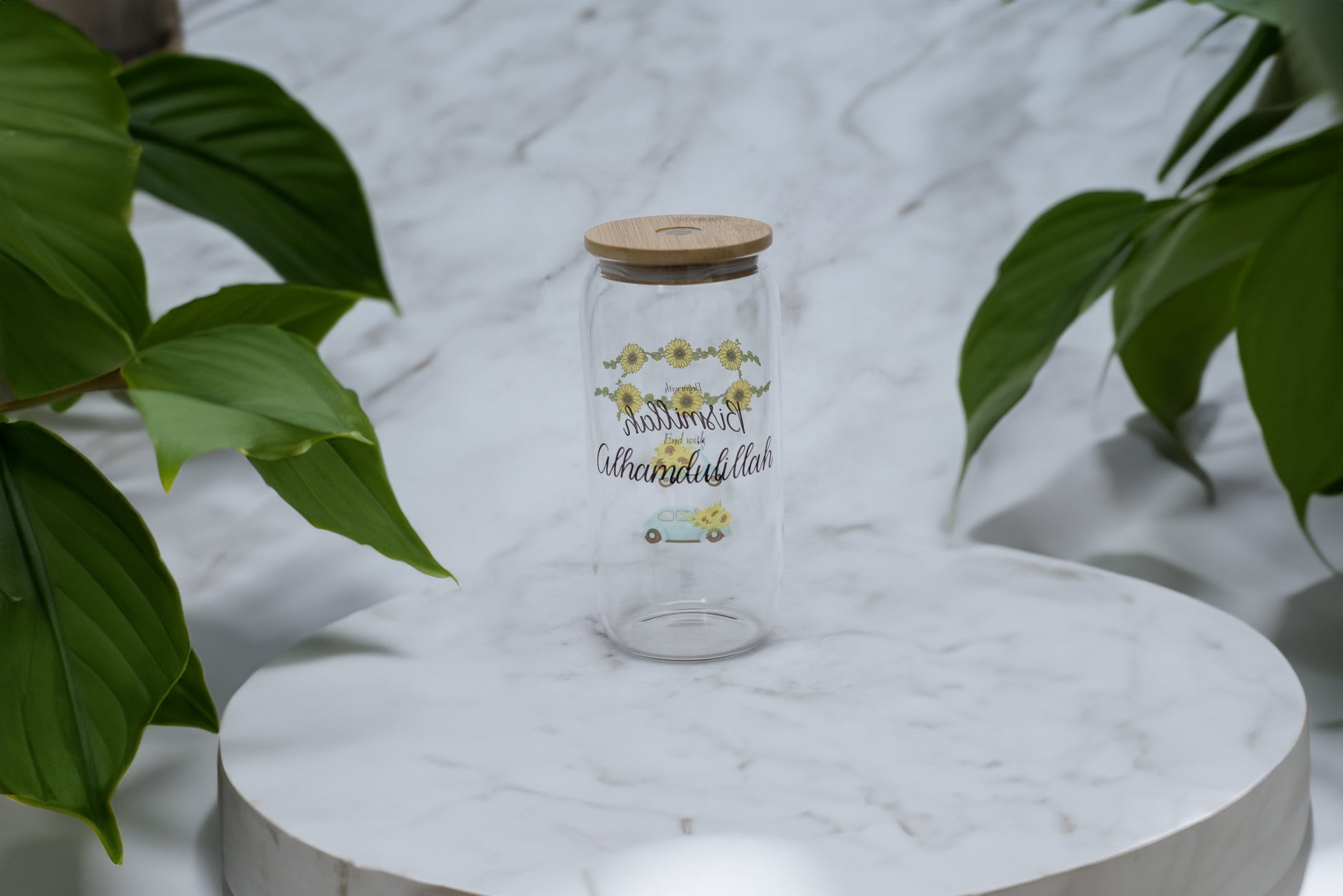 Double sided frosted and clear glass tumbler with bamboo lid and glass straw.