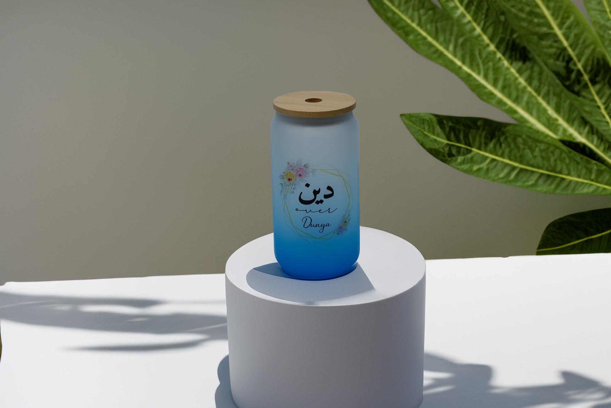 Frosted Blue glass tumbler with bamboo lid and glass straw.