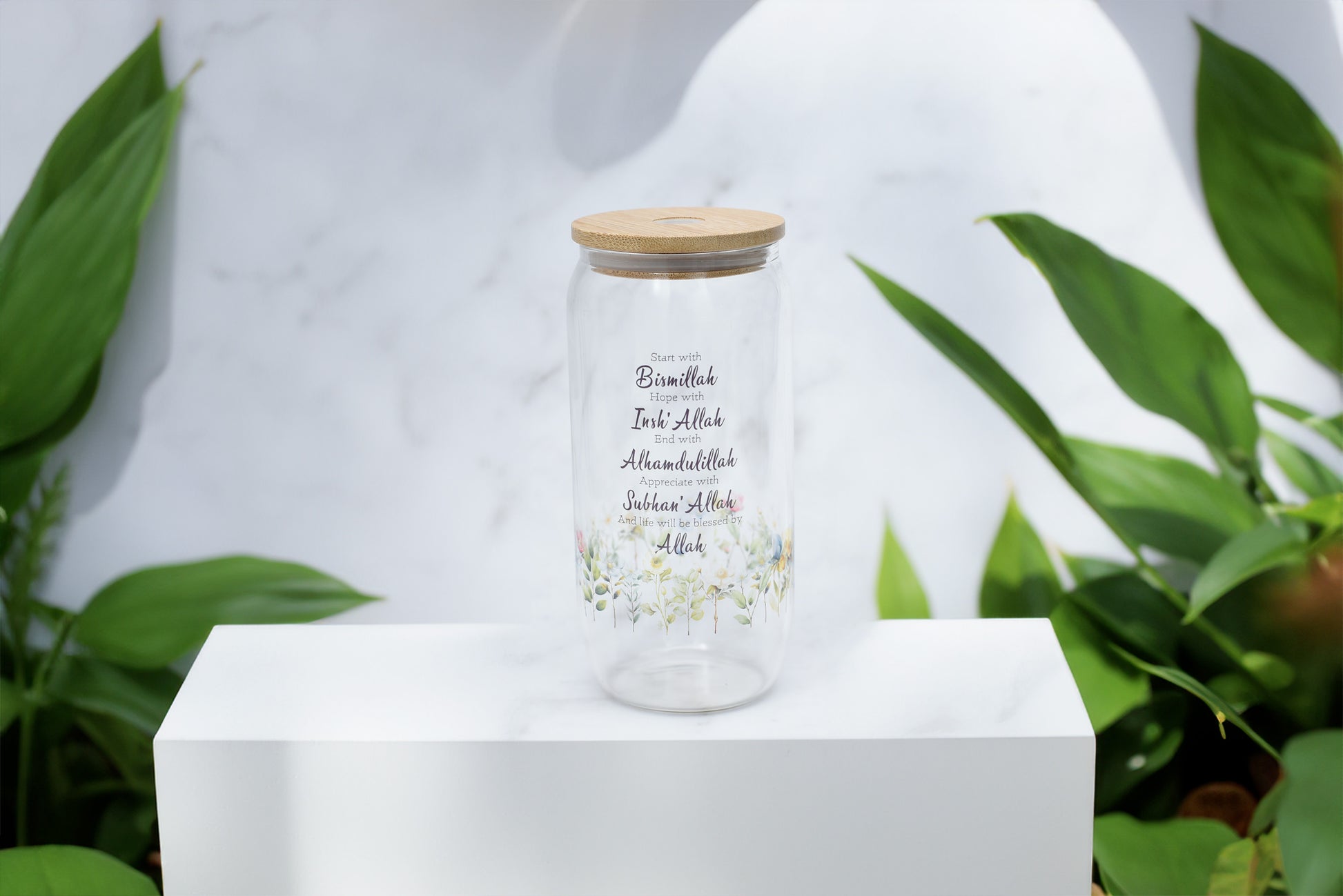 Frosted and clear glass tumbler with bamboo lid and glass straw.