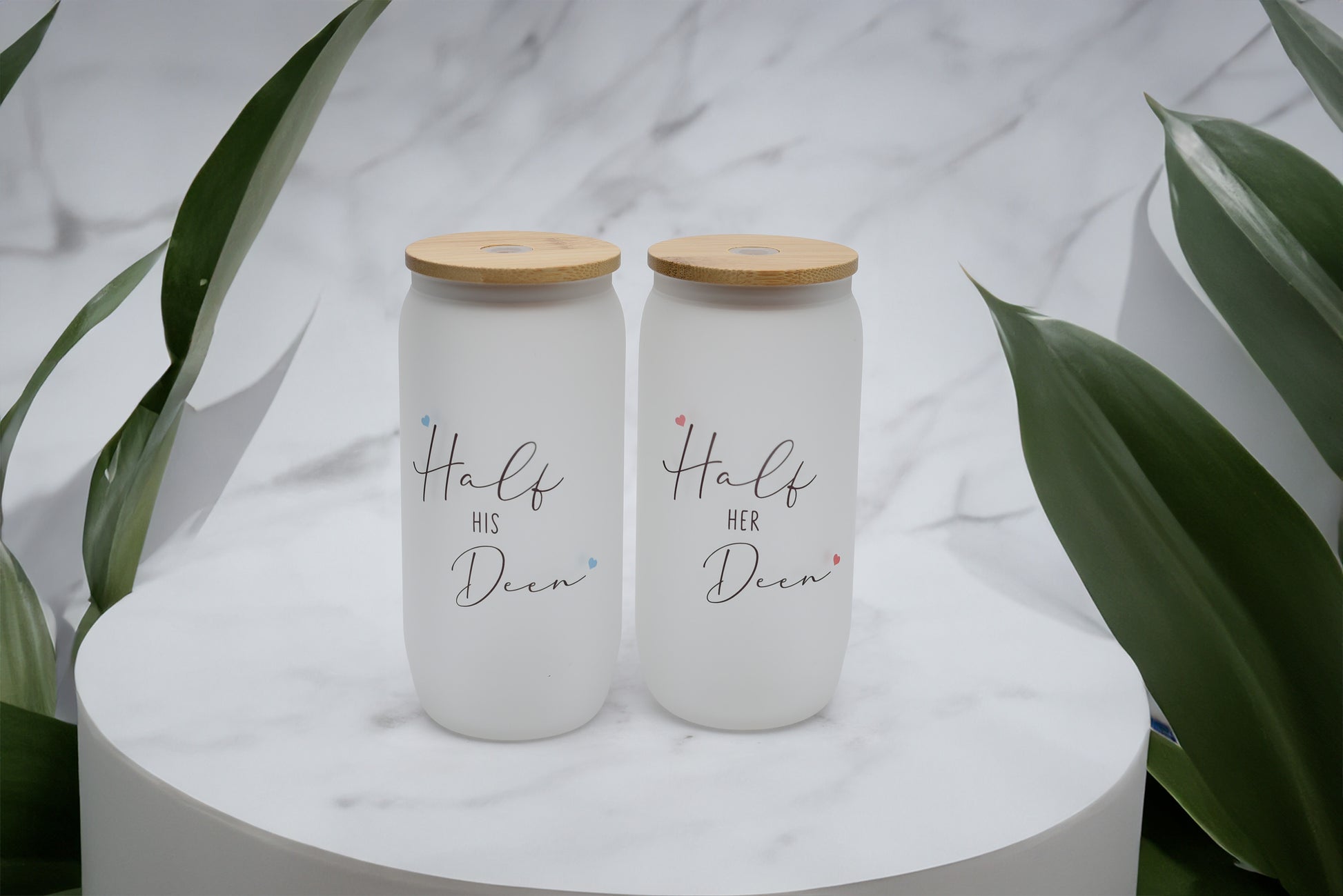 Frosted and clear glass tumbler with bamboo lid and glass straw.