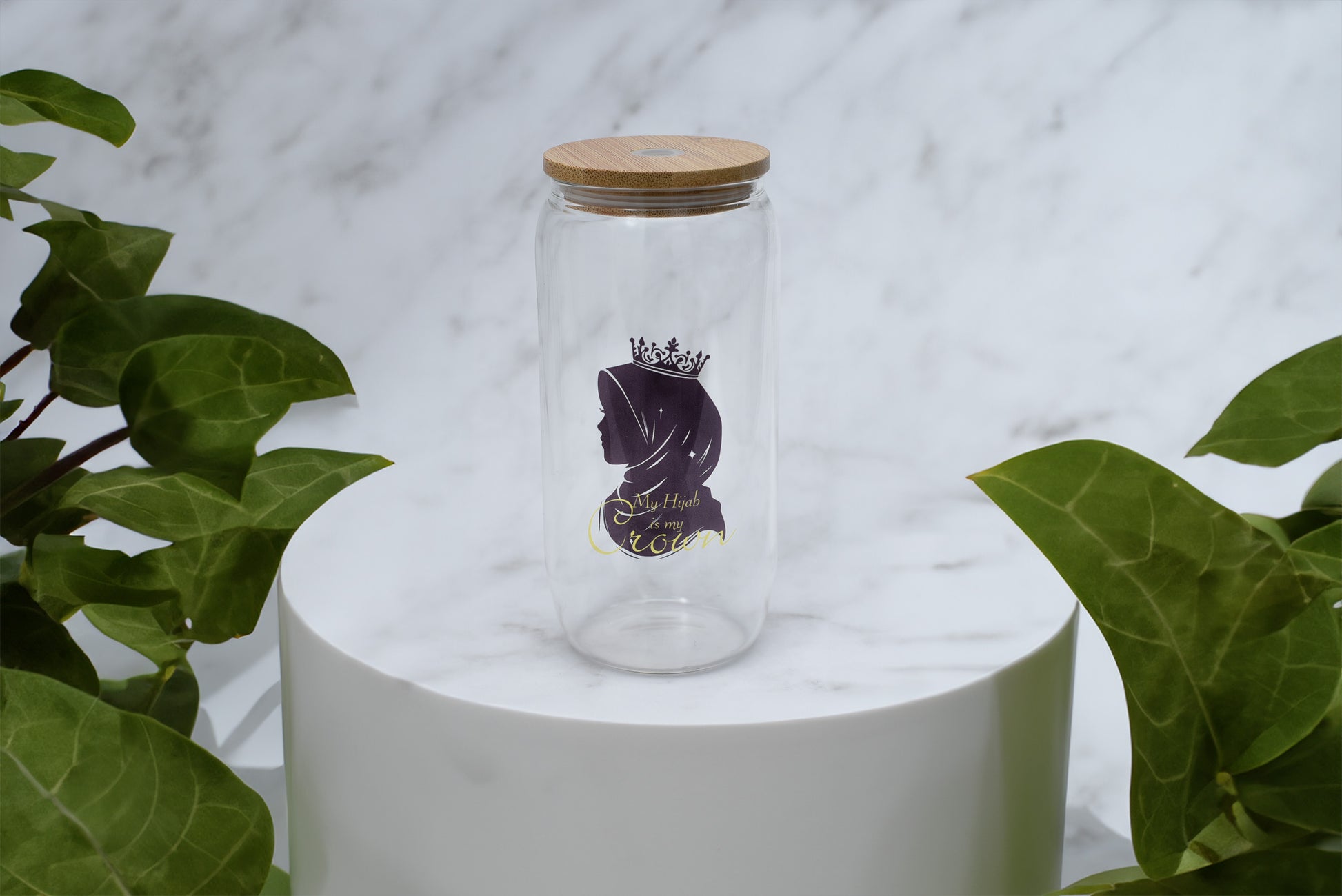 Frosted and clear glass tumbler with bamboo lid and glass straw.